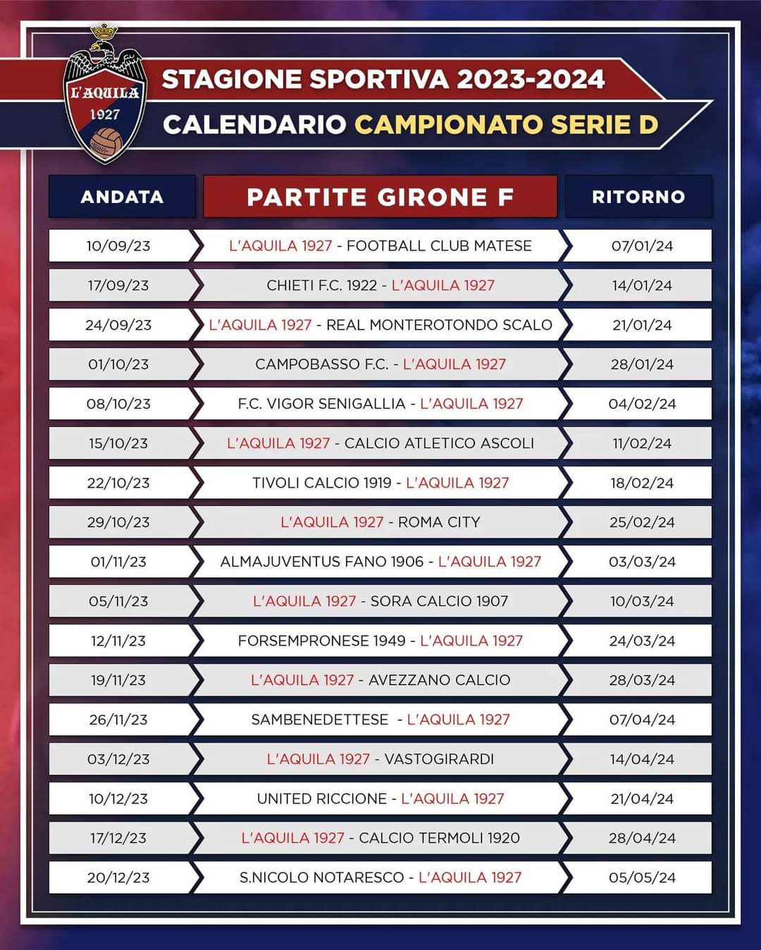 La LND ha diramato in mattinata i calendari della stagione 2023/24 di Serie D. Per quanto riguarda il Girone F si comincia domenica 10 settembre,