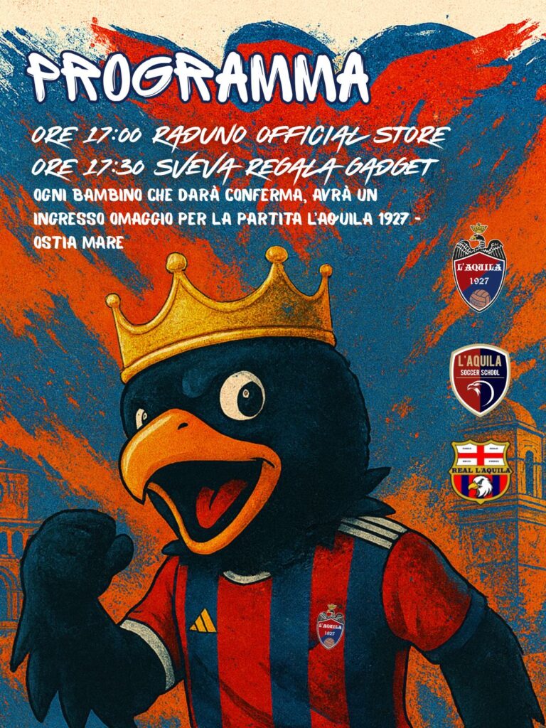 L’Appuntamento è per sabato 6 dicembre 2025 alle 17.30 presso lo Sport Hub di Corso Vittorio Emanuele, 79. Ospite del pomeriggio sarà la nostra mascotte Sveva, che oltre a presentare la nuova linea di abbigliamento, omaggerà tutti i giovani tesserati di Academy L’Aquila Calcio, Real L’Aquila e L’Aquila Soccer School con tante piccole sorprese.